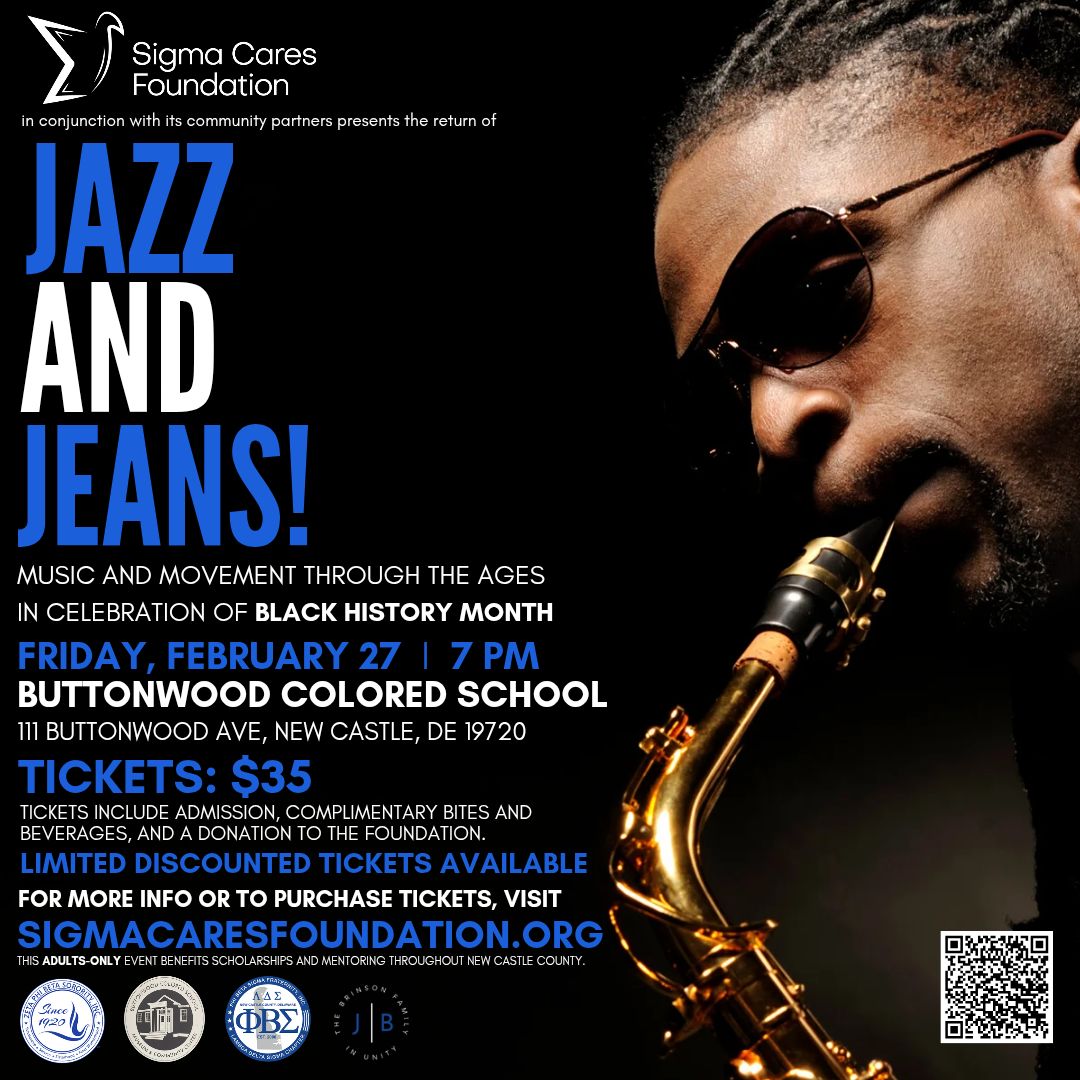 Sigma Cares Foundation presents Jazz and Jeans February 27, 2026 PBSLDS Admin When 02/27/2026 7:00 pm - 10:00 pm Add To Calendar Download ICS Google Calendar iCalendar Office 365 Outlook Live Where Buttonwood Colored School and Museum 111 Buttonwood Ave, New Castle, DE, 19720 Event Type LDS Events SCF Events Loading Map.... 111 Buttonwood Ave - New Castle View Events 39.679775 -75.550073 https://www.zeffy.com/en-US/ticketing/jazz-and-jeans-the-return-hosted-by-the-sigma-cares-foundation